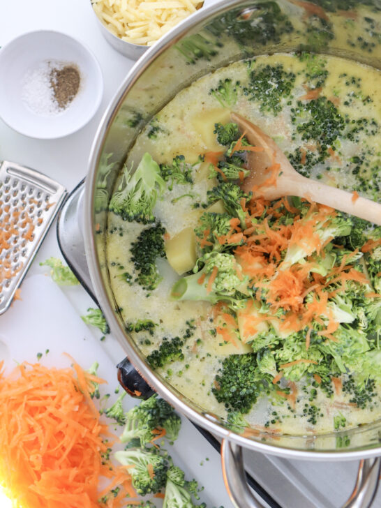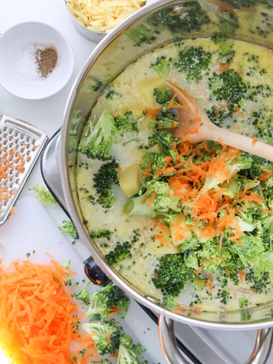 - Add the chopped broccoli, potato and grated carrot to the pot. Cook for about 25-30 minutes, or until the broccoli is tender.