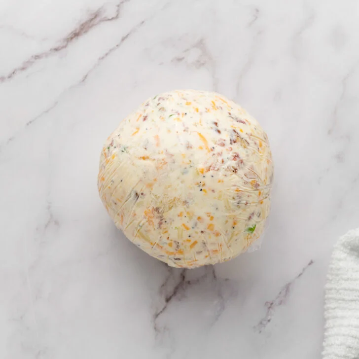 - Put a piece of saran wrap on the counter and put the cheese ball in it. Then fully wrap it up with the saran wrap and form it into a ball.