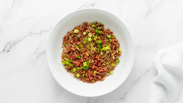 - In a shallow bowl, add the remaining chopped pecans, bacon bits and scallions.