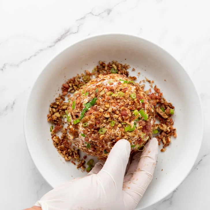 - Roll the cheeseball around in the prepared shallow bowl and make sure the whole ball is coated with the remaining coating.