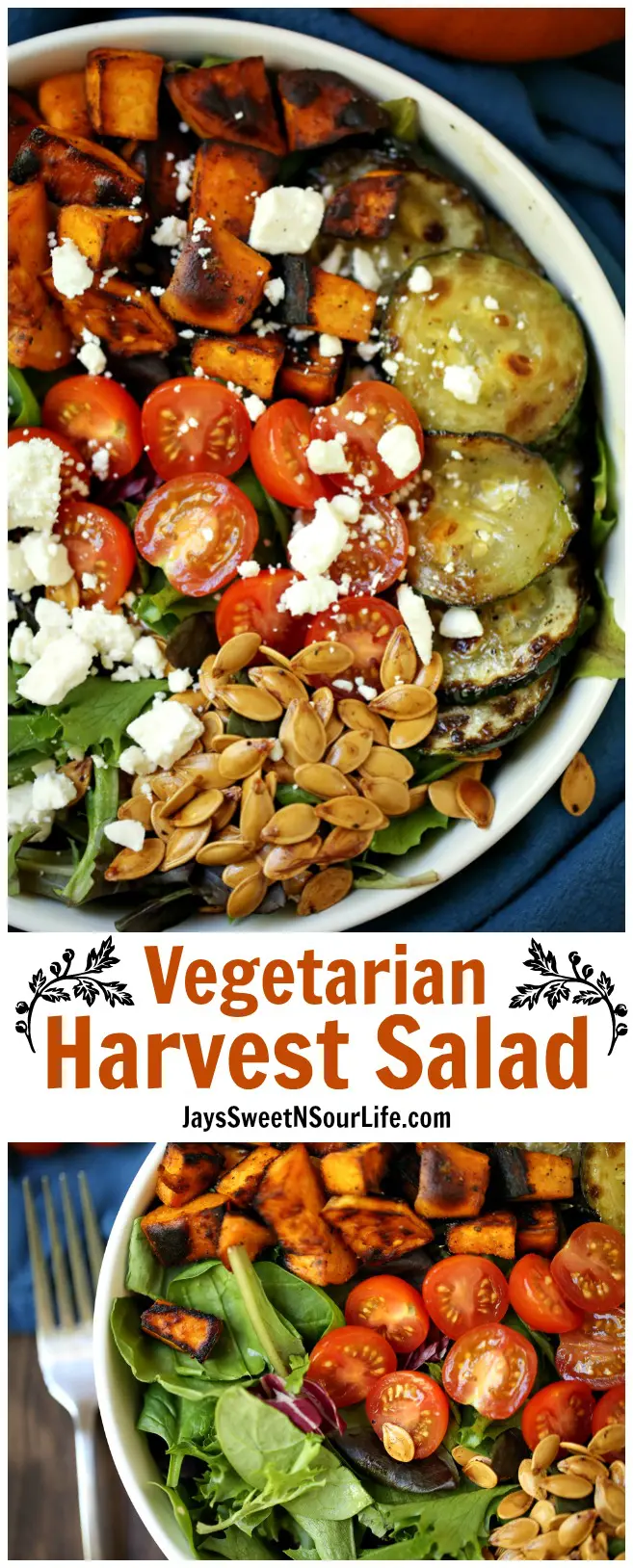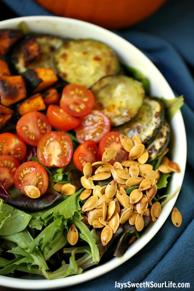 A tasty fall-inspired Vegetarian Harvest Salad, that features oven-roasted vegetables, pumpkin seeds, and cherry tomatoes. This fall harvest salad is topped with your favorite brand of balsamic vinegar and then sprinkled with feta cheese.