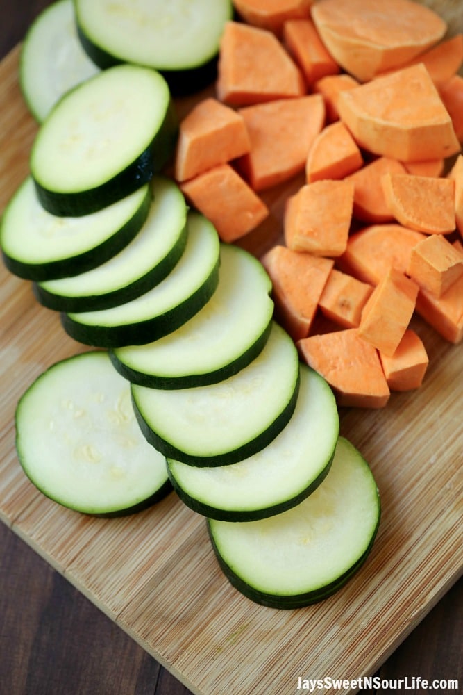 - While that is going on, cut sweet potato into squares, saute' with a little oil/garlic until the sides are browned. Set aside, then slice zucchini and saute' the same way.